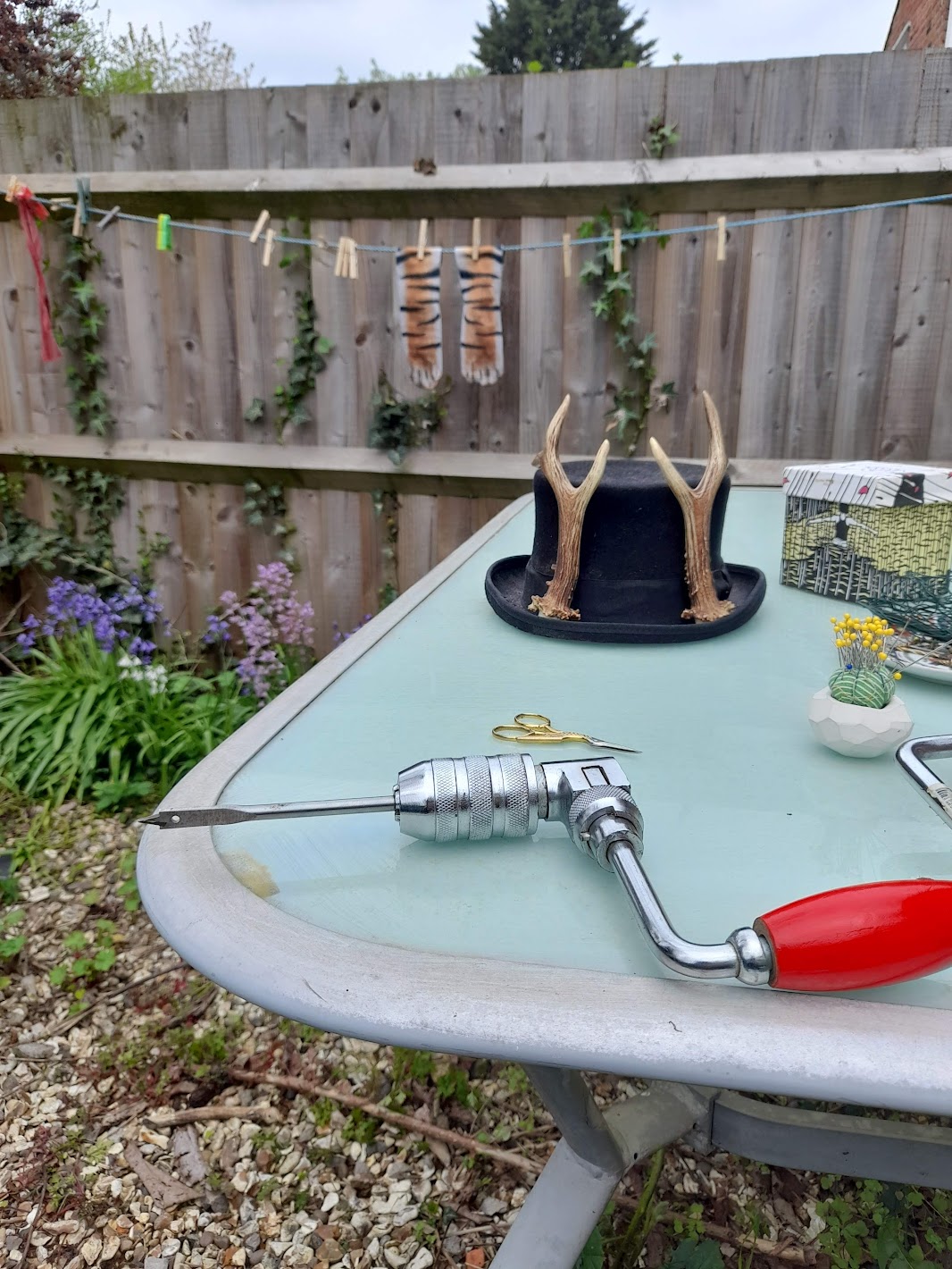 Like so many festive occasions, the preparation was half the fun, and 2,643 times the work. The challenges of affixing the horns John had acquired to the hat I had worn for Armaleggan did, I confess, bring me to tears. But it was ok. Joe gallantly offered the use of his electric drill (not pictured), and Teru came to the rescue when I mangled the brim and was mired in fabric glue. We got there in the end.