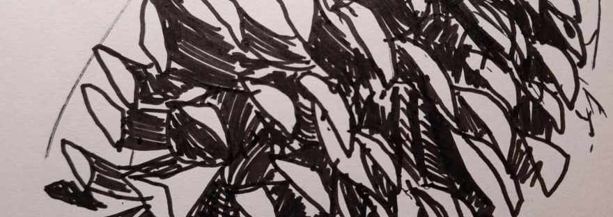 In the depths of winter, I find reassurance in the quiet patience and dormant life of a pine cone. Its sturdy symmetry is comforting. Drawing gives me the opportunity to observe its ragged regularities and geometric modulations with keen attention. Somewhere between a rock and a flower, its scales are sturdier than petals. Easier, I find, to keep track of. They aren’t shy about taking up space.
